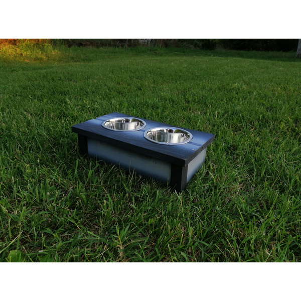 Дървена поставка с две купи за храна и вода.Подходяща за използване на открито и в закрити помещения. В комплект с нашите Приказни къщи или поотделно. Дървената поставка е изработена детайлно с естествени, висококачествени материали, което я прави красива и в същото време здрава. В съчетание с Вашия стил тя може да бъде боядисана с безвредни бои на водна основа, импегнирана или опушена. Металните купи са изработени от неръждаема стомана в разлчни размери.