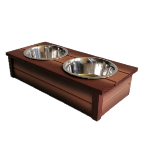 Дървена поставка с две купи за храна и вода.Подходяща за използване на открито и в закрити помещения. В комплект с нашите Приказни къщи или поотделно. Дървената поставка е изработена детайлно с естествени, висококачествени материали, което я прави красива и в същото време здрава. В съчетание с Вашия стил тя може да бъде боядисана с безвредни бои на водна основа, импегнирана или опушена. Металните купи са изработени от неръждаема стомана в разлчни размери.