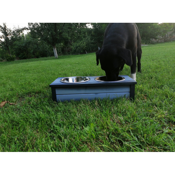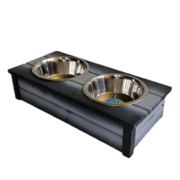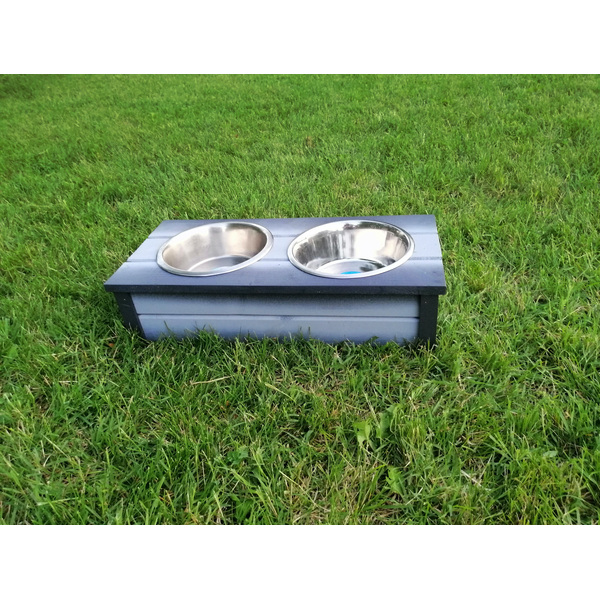 Дървена поставка с две купи за храна и вода.Подходяща за използване на открито и в закрити помещения. В комплект с нашите Приказни къщи или поотделно. Дървената поставка е изработена детайлно с естествени, висококачествени материали, което я прави красива и в същото време здрава. В съчетание с Вашия стил тя може да бъде боядисана с безвредни бои на водна основа, импегнирана или опушена. Металните купи са изработени от неръждаема стомана в разлчни размери.