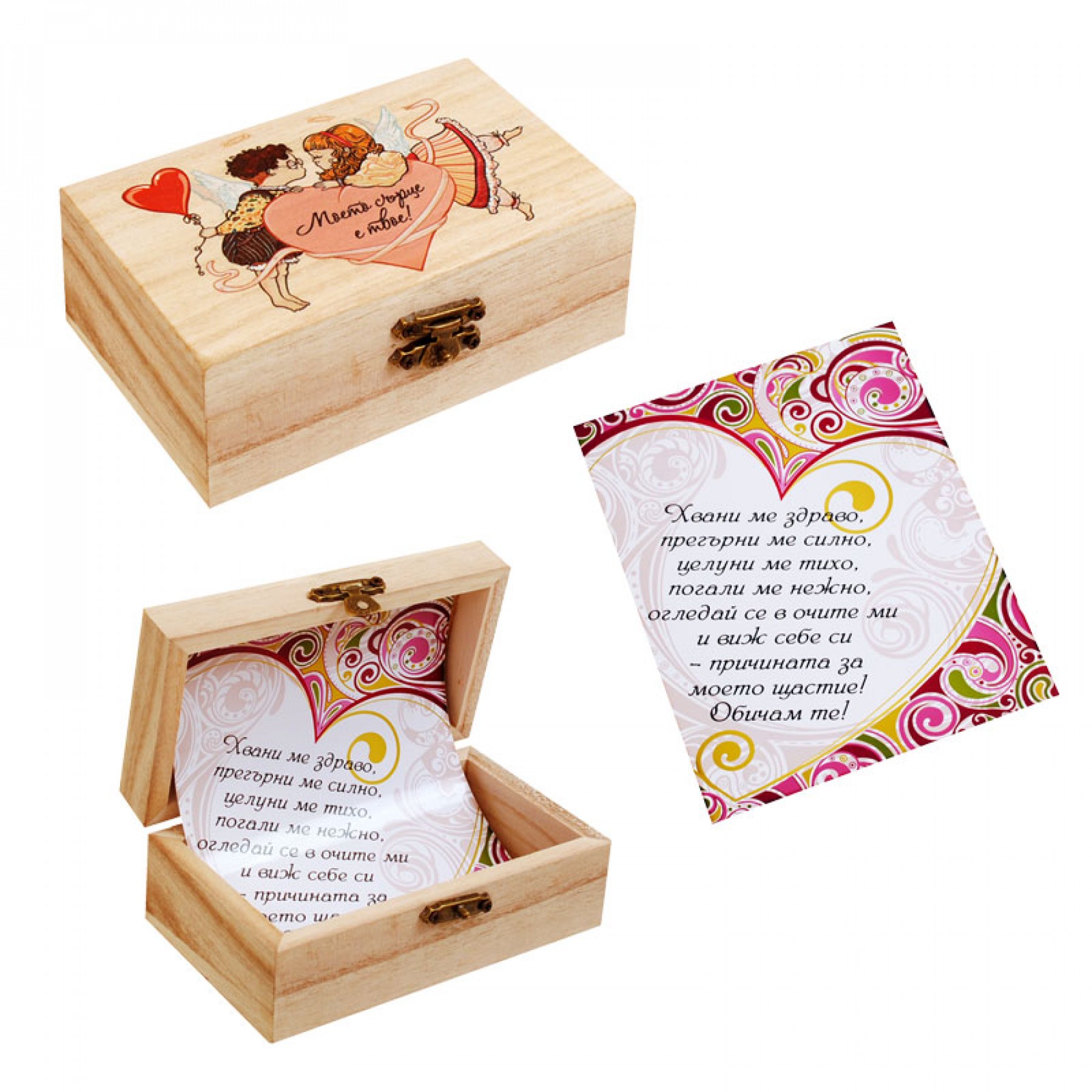Дървена кутия за влюбени с пожелание "Моето сърце е твое" .