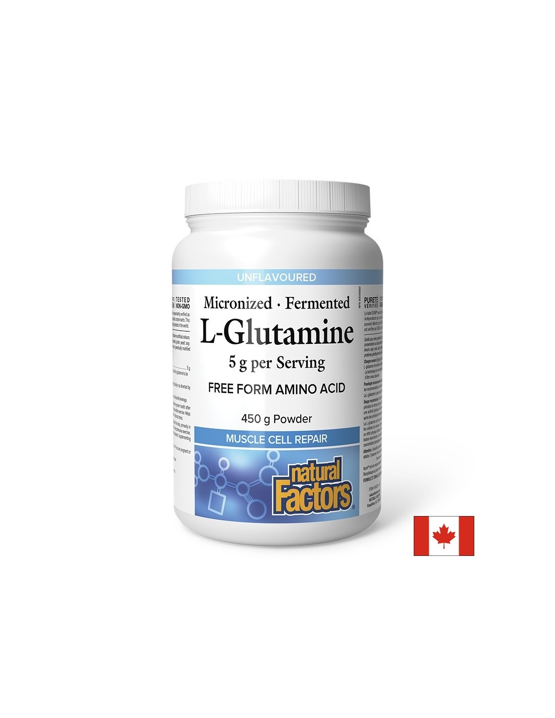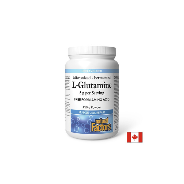 Л-Глутамин (микронизиран) на Natural Factors е хранителна добавка за спортисти, която спомага за възстановяване нивата на глутамин в организма след интензивни тренировки и физически стрес. Допринася за растежа на мускулите по естествен и безопасен начин и подобрява енергийните нива. Съдейства за намаляване на загубата на мускулна тъкан и оформянето на по-добър релеф. Също така подсилва имунитета и храносмилателната система и е доказано, че укрепва чревната бариера, за да я предпази от предизвиканата от тренировки чревна пропускливост.