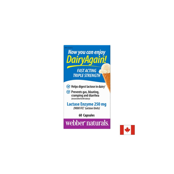 Лактаза ензим предлага бързо, превантивно облекчаване на типични симптоми на непоносимост към лактоза и съдейства за подобряване на храносмилането на храни, съдържащи лактоза (мляко и други млечни продукти). Продуктът на Webber Naturals съдържа 9000 единици FCC киселинна лактаза във всяка капсула.