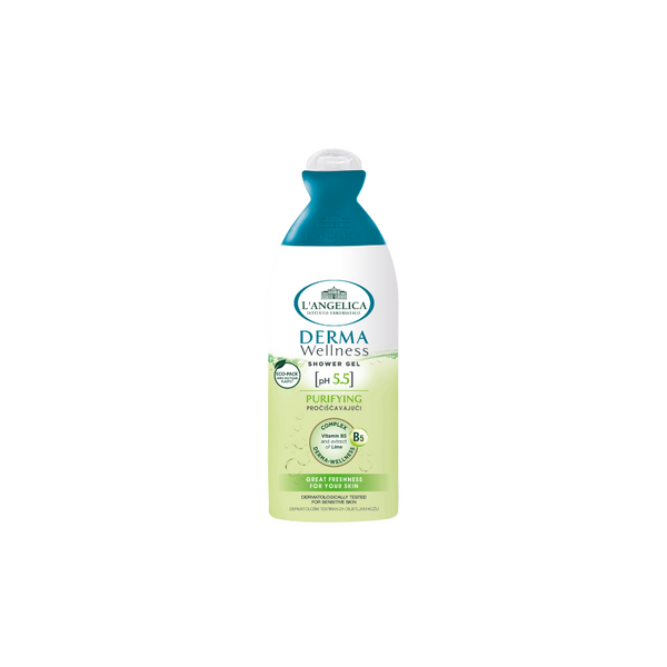 L'ANGELICA DERMA WELLNESS ДУШ-ГЕЛ PURIFYING 250мл.\n\n\n\nПозволете си да се поглезите с нежността на новия L'Angelica Derma-Wellness Purifying душ гел, обогатен с ценен витамин B5 и натурален екстракт от липа. Витамин B5 придава на кожата ви блясък, а натуралният екстракт от лайм, благодарение на добре познатите си пречистващи свойства, поддържа естествения баланс на кожата ви, правейки я видимо по-чиста и копринена. Новата формула съчетава успокояващото действие на витамин B5 и пречистващото действие на лайма със специалните свойства на новия L'Angelica Derma-Wellness Complex, който оставя свеж аромат.