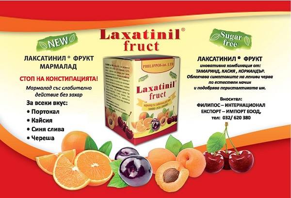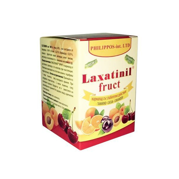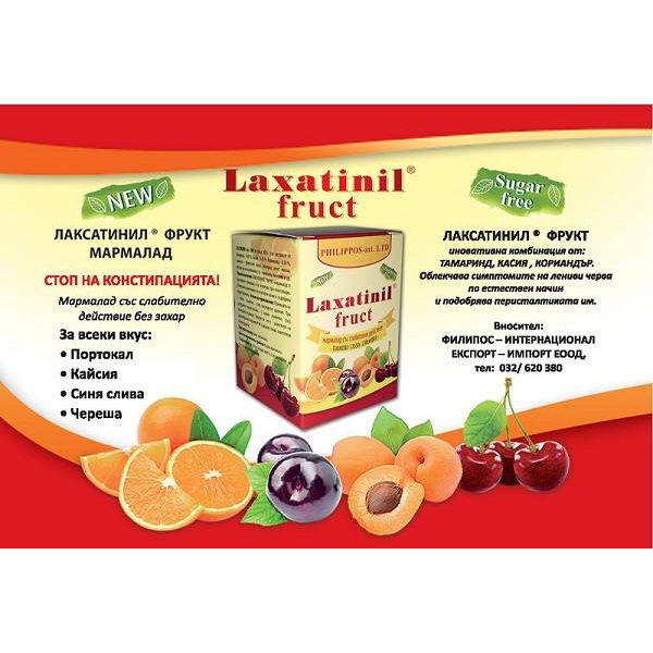 Laxatinil Fruct Marmalade е диетичен мармалад със слабително действие. Формулата на Лаксатинил Фрукт мармалад комбинира тамаринд, кайсия и кориандър. Има отличен ефект за преодоляване на симптоми на нередовен стомах, лениви черва и запек. Употребата му подкрепя чревната и стомашната перисталтика и съдейства за прочистването на храносмилателната система. Употребата му съдейства за общата детоксикация на организма, подобрява здравето на чревната флора и има диуретичен ефект. Синя слива/череша/кайсия или портокал, сухи екстракти: тамаринд - 0.40 %, касия - 0.20 %, кориандър - 0.20 %, глюкозо - фруктозен сироп, желиращ агент: пектин, регулатор на киселинността - лимонена киселина и др.