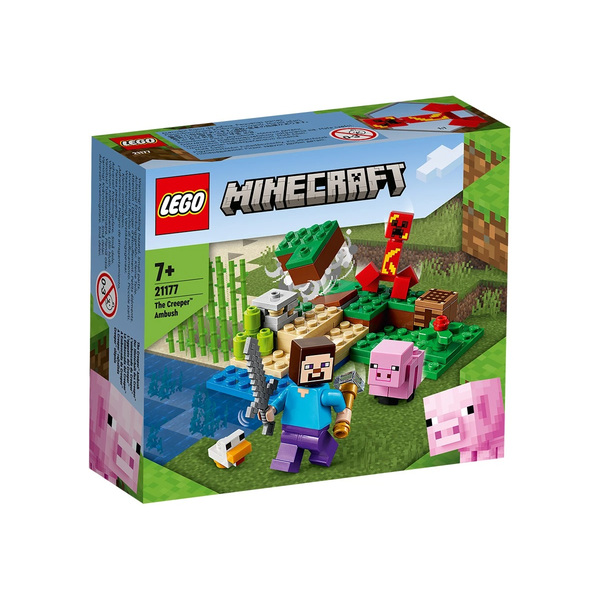 Изпълнен с герои, аксесоари и функции от Minecraft®, комплектът LEGO® Minecraft® Засада на Creeper™ (21177) е страхотен подарък за деца на 7 и повече години. Голямо забавление в малък комплект за играчи на Minecraft Има много неща, които да заинтригуват децата, в това компактно, класическо приключение от Minecraft. Към един от героите на играта, Steve, се присъединяват прасенце, пиленце и експлодиращ Creeper. Първо, децата проявяват творчество с желязна руда на работната маса. След това се грижат за животните, грижат се за реколтата от захарна тръстика и украсяват сцената с макове. След това те използват меч, за да се бият със страховития експлодиращ Creeper. Битката завършва с това, че деца натискат специалния детонационен блок, който взривява експлодиращия Creeper във въздуха. Когато действието приключи за деня, този забавен комплект изглежда страхотно на показ в детските стаи.