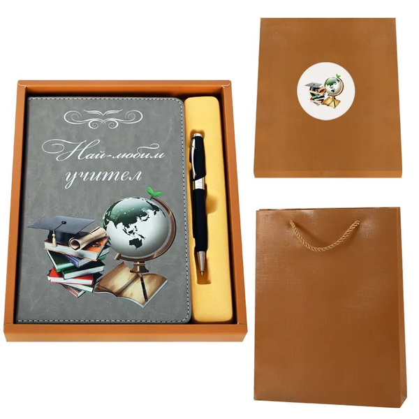 Луксозен комплект "Най-любим учител" с кожен бележник мелатен химикал в подаръчна кутия и опаковка.