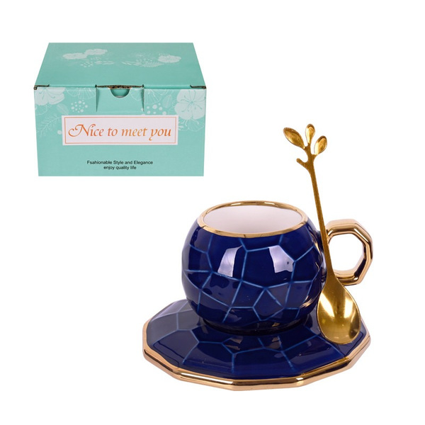 Луксозна релефна чаша с чинийка и лъжичка /тъмно син/