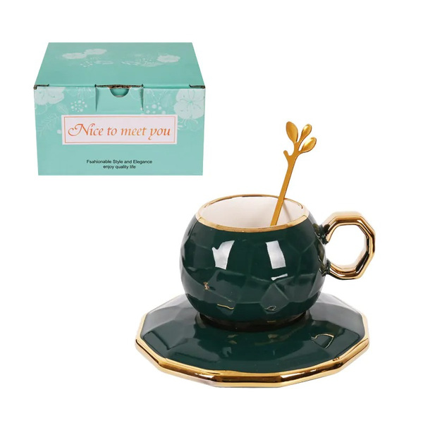 Луксозна релефна чаша с чинийка и лъжичка /керамика/.