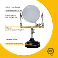 <p>Лещата е произведена от оптично полимерно стъкло и осигурява ясно и детайлно изображение на увеличавания обект. Нейното издръжливо метално тяло гарантира стабилна стойка и дълъг срок на експлоатация. Всички лупи в тази серия имат държачи тип „трета ръка“, които закрепват надеждно предметите. </p>