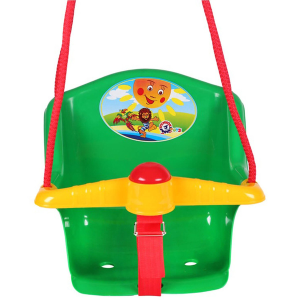 Цветна пластмасова люлка с въжета, подходяща за двора или за закачане на тавана у дома. Седалката е удобна за ползване заради формата си, освен това е и обезопасена с подвижен преден ограничител. А за да е играта още по-интригуваща, люлката е снабдена с весела картинка и свирка.