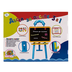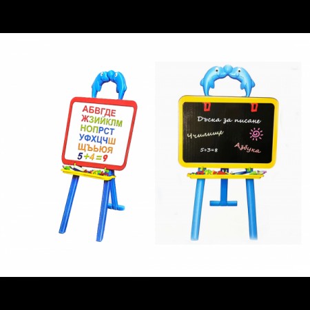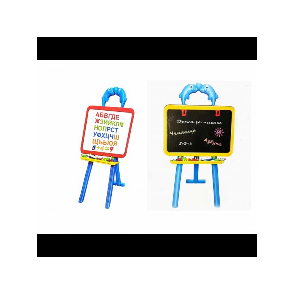 Дъската е с две лица. Едната страна е бяла с магнитна повърхност, за нареждане на магнитните букви и елементи и също за писане и рисуване с флумастера. Другата страна е черна , предназначена за писане и рисуване с тебеширите. Може да освободите дъската от стойката и да я окачите на стена. А когато детето се умори от учене, може да се отдаде на разпускащо творчество върху бялото платно с вълшебния маркер или с тебешири по черната дъска.