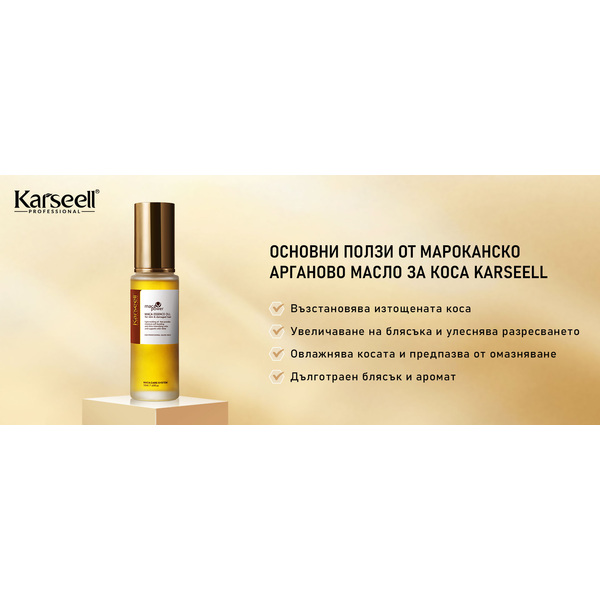 Студено-пресованото етерично арганово масло е предназначено за възстановяване на суха и увредена коса. Комбинация от арганово масло, масло от чаено дърво, масло от лайка, алое и екстракти от водорасли, подмладява, дълбоко подхранва и възстановява косата, като подобрява еластичността и запазва блясъка.