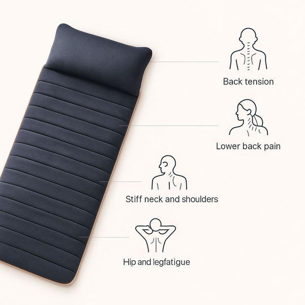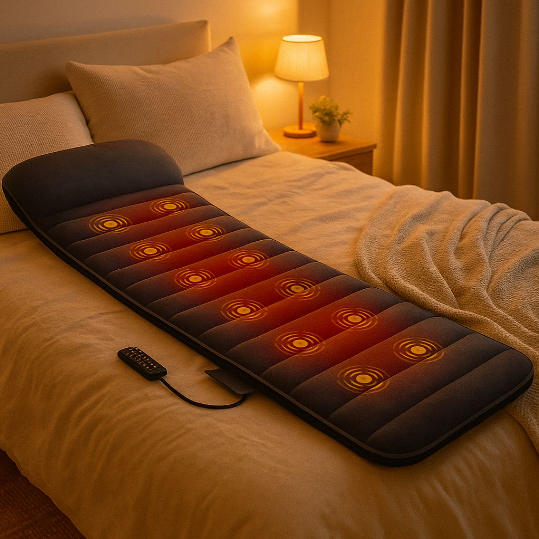 е перфектното решение за пълна релаксация и облекчаване на болки и напрежение в цялото тяло. С 4 масажни зони (врат, рамене, гръб и седалище/бедра), той успокоява болки, схващания и мускулна скованост. Матракът предлага 3 нива на интензивност и 10 вибрационни мотора, които облекчават напрежението и подобряват кръвообращението. Допълнителната функция за затопляне усилва ефекта от масажа. Луксозното плюшено покритие с мемори пяна осигурява максимален комфорт по време на използване.