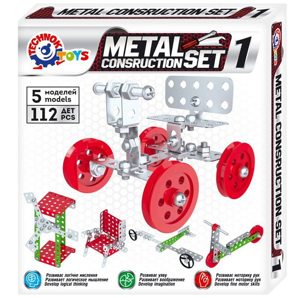 метален конструктор 20 х 19 х 4 с болтове гайки инструменти и гуми 112 части 5 модела в 1 с поддръжка