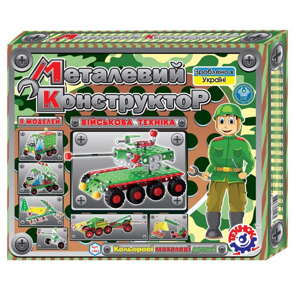 метален конструктор 30х25х4 с болтове гайки инструменти и гуми за направа на военна техника 8 модела