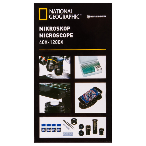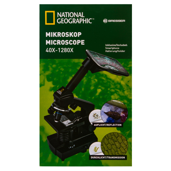 <p>Bresser National Geographic 40x–1280x Microscope is a wonderful entry-level microscope with a smartphone holder. It will become a great companion in studies or hobby. This modern microscope features combined illumination that allows for observing both transparent and opaque samples in reflected and transmitted light. Due to a special smartphone holder, you will be able to observe samples on a smartphone screen and take photos. Capture your research and save pictures on your smartphone. A wide magnification range (40x–1280x) is convenient for biological studies and observing versatile samples.</p>