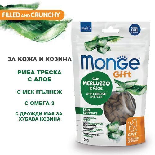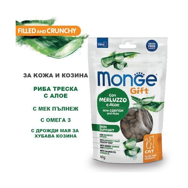 Включените функционални съставки, като алое вера за поддържане на целостта на кожата и здравето на козината, бирена мая за защита на имунитета и масло от сьомга като източник на Омега-3, са резултат от изследване, направено в Италия от Monge.