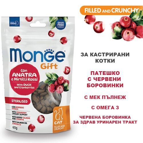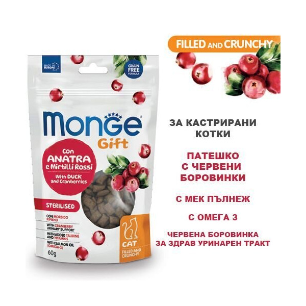 Включените функционални съставки, като червена боровинка за здравето на уринарния тракт, бирена мая за защита на имунитета и масло от сьомга като източник на Омега-3, са резултат от изследване, направено в Италия от Monge.