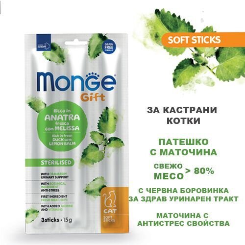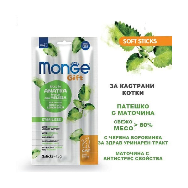 Меки стикчета от натурално месо, богати на прясно патешко с маточина и червени боровинки.