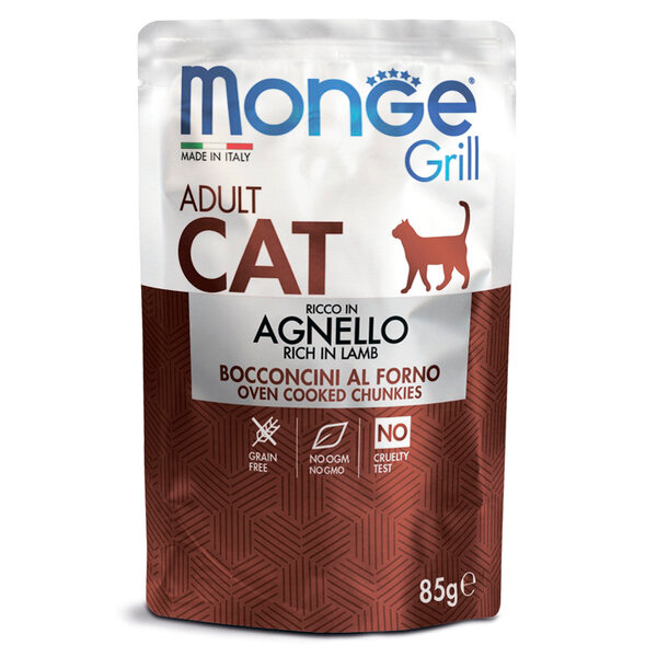 Пауч хапки в желе с агнешко за котки в зряла възраст Monge Grill са хапки, приготвени на фурна, в желе, които максимално наподобяват естествената диета на вашите котки.