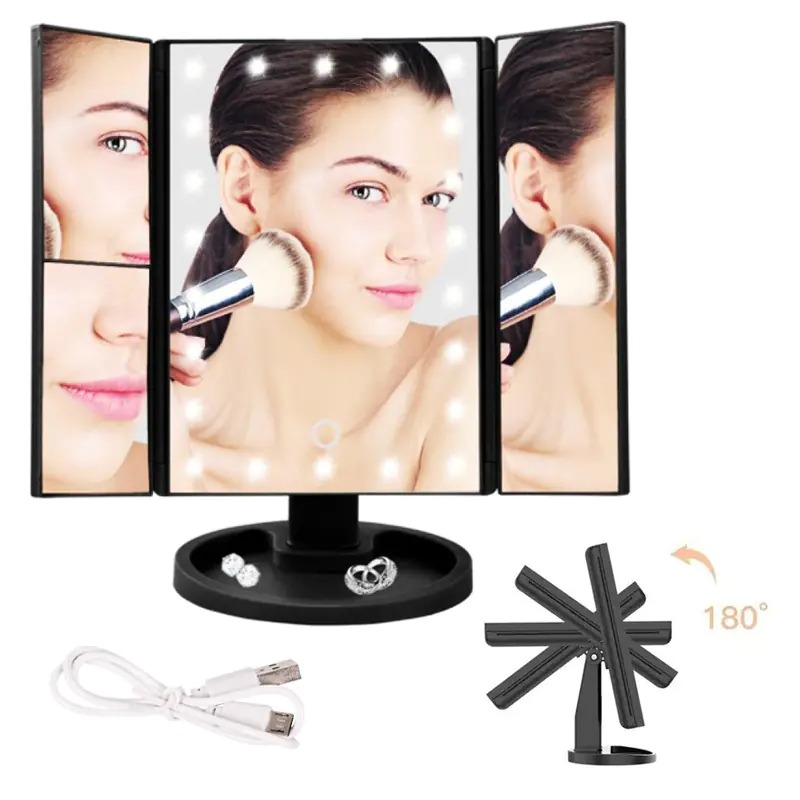 Настолно огледало с три увеличителни огледала, LED осветление и USB кабел за зареждане и място за батерии.