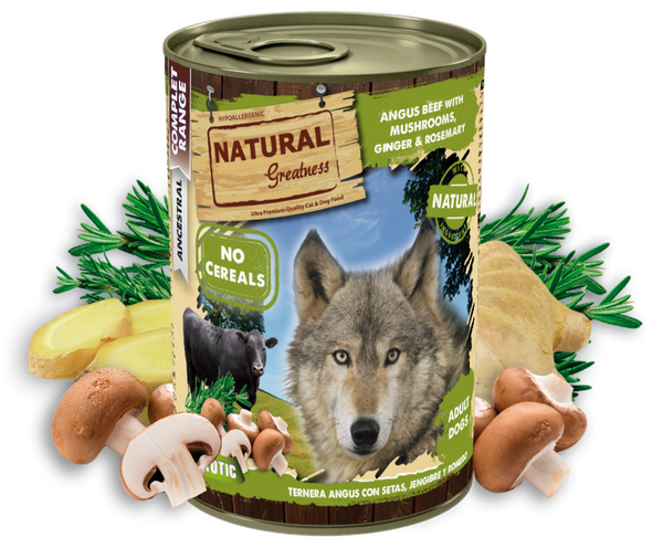 Natural Greatness Dog Angus Beef with Mushrooms е премиум консерва за кучета, предлагаща висококачествено и изключително полезно хранене, съчетаващо изискания вкус на Телешко Ангъс с ароматни подправки и гъби.