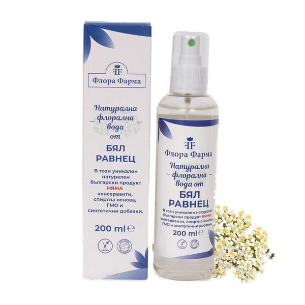 Натуралната флорална вода от бял равнец на Флора Фарма ЕООД е извлечена чрез първична парна дестилация на свежата билка и е с високо съдържание на етерично масло (от 0,05 – 0,08%). Именно поради високата концентрация на етерично масло и восъци е възможно образуването на видимо забележими нишки в продукта, което в никакъв случай не бива да притеснява потребителя.