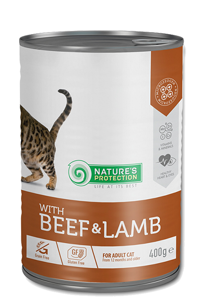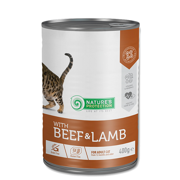 Пълноценна храна с говеждо и агне за израснали коткиМократа храна за котки "Nature's Protection" е съобразена с различни нужди на млади и възрастни котки. Висококачественото естествено месо и риба, които могат да се използват за консумация от човека, е основният източник на протеини. Той е идеално допълнение към храненето със суха храна "Nature's Protection". Готовата за сервиране мокра котешка храна с оптимално количество за едно хранене е много удобна за използване у дома, по време на пътуване или на изложения.