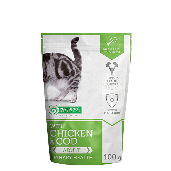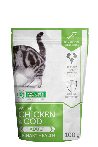 Nature’s Protection с пиле и риба треска за здрава отделителна система е пълноценна и високо качествена мека храна за котки с пиле и риба треска. Специална формула, която може да помогне функцията на отделителната система. Храната е в лесни за употреба паучове.