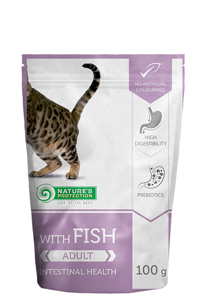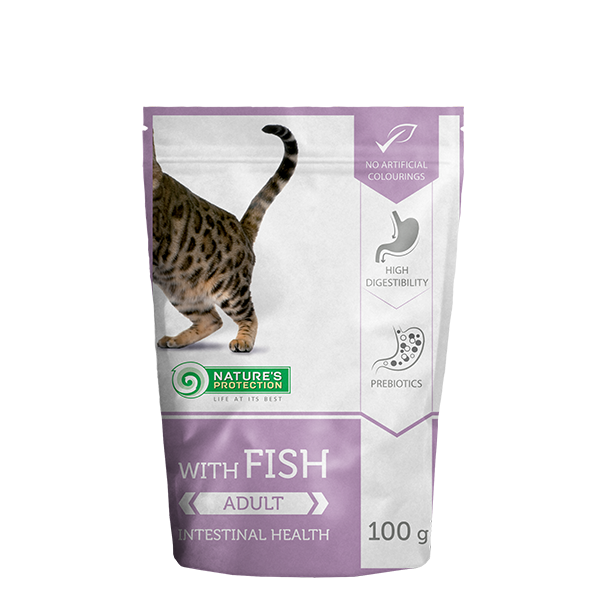 Nature’s Protection с риба за израснали котки е пълноценна и високо качествена мека храна.Специална формула, подпомагаща здравето на храносмилателната система. Храната е в лесни за употреба паучове.