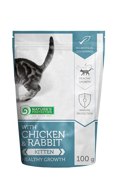 Nature’s Protection с пиле и заек за подрастващи котки е пълноценна и високо качествена мека храна за котки. Специална формула, помагаща за доброто израстване и развитие на подрастващите млади котки. Храната е в лесни за употреба паучове.