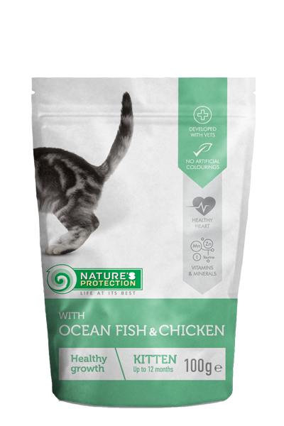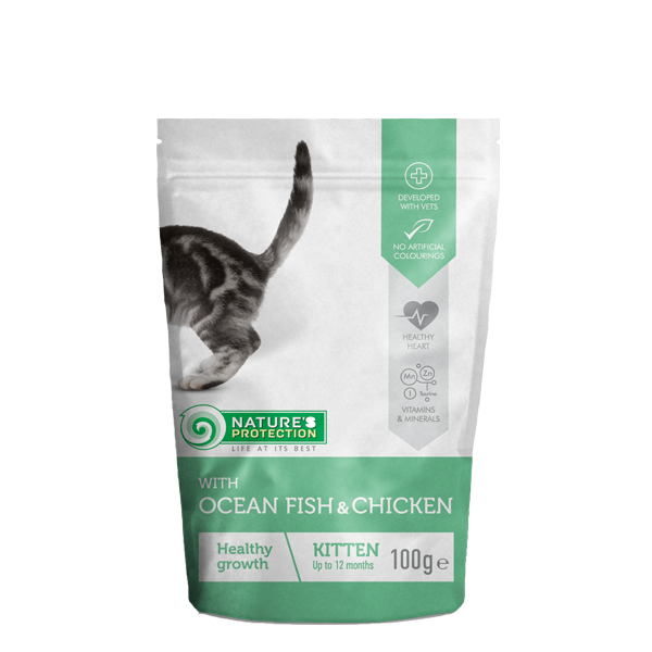 Nature's Protection Kitten консервирана храна за млади котки с океанска риба и пиле е това, което е необходимо, за да поглезите любимия си четириног приятел. Протеините от животински произход се усвояват лесно в състава на храната. Те не натоварват тялото и са идеални за растящото тяло на котката.
