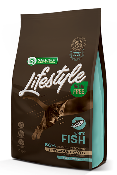 100% пълноценно и балансирано хранене за израснали котки с хипоалергенна бяла риба.