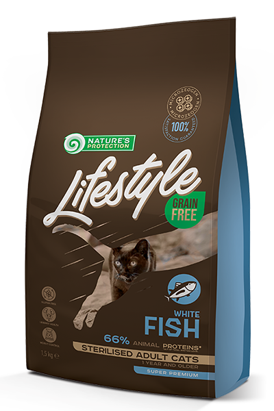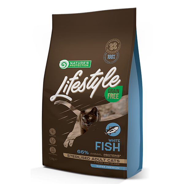 100% пълноценно и балансирано хранене за стерилизирани котки с хипоалергенна бяла риба.