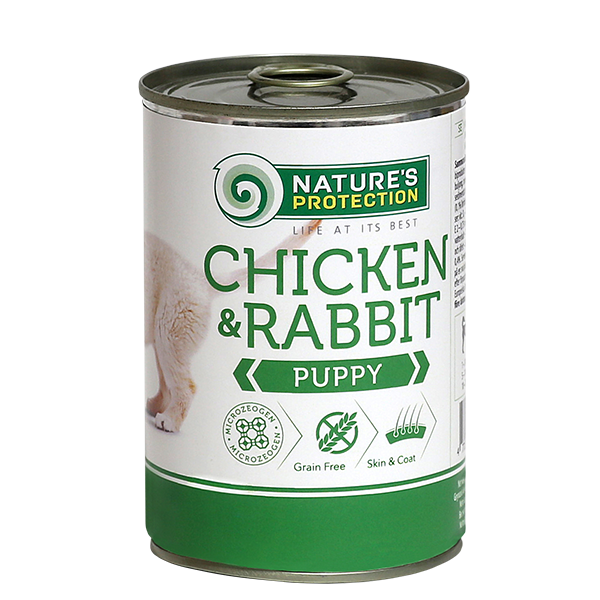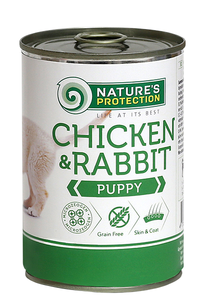 "Nature's Protection" мокра храна за кучета е приспособена да задоволи различните нужди на млади и растящи кучета. Високото качество натурално месо и риба, което може да използвано за човешка консумация, е основният източник на протеин. Внимателно сготвено, за да запази естествения си вкус и аромат и да запази хранителните си качества за всяка рецепта. Идеално допълнение към храненето със суха храна "Nature's Protection". Готовата за сервиране мокра кучешка храна в оптимално количество за едно хранене е много удобна за употреба у дома, по време на път или на изложби. Puppy Пилешко & Заешко мокра храна съдържа парченца натурално пилешко и заешко месо във вкусен бульон, обогатен с минерали.
