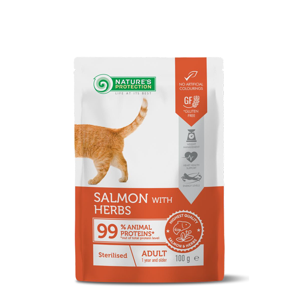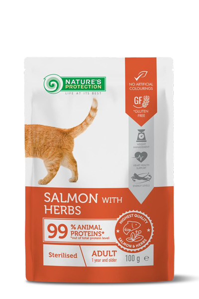Пауч за израснали стерилизирани котки със сьомга и билки.