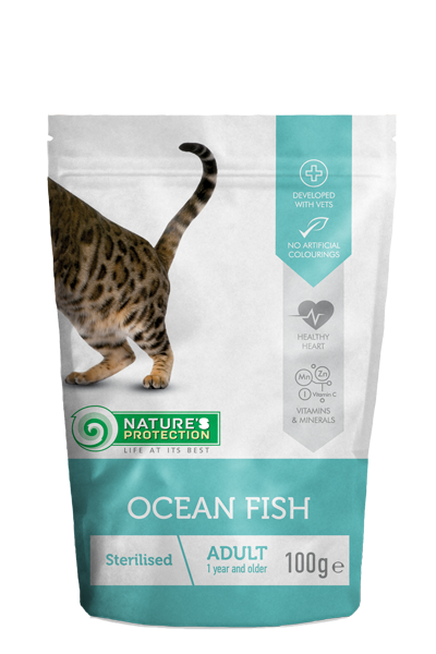 Океанската риба е ценена заради антиалергичните си свойства, богата е на витамини А и D. Има ниско съдържание на мазнини, така че не натоварва храносмилателната система на домашния любимец и помага за поддържане на оптималното тегло на стерилизираната котка.
