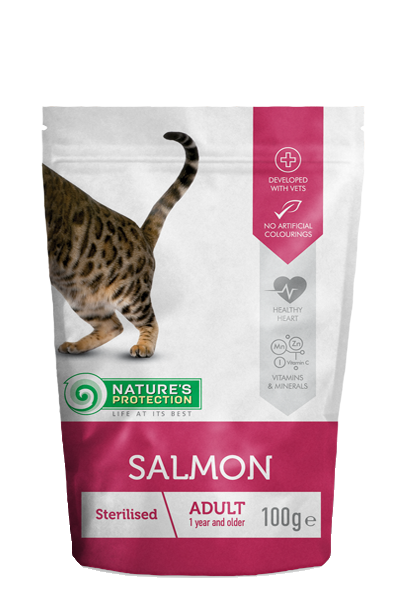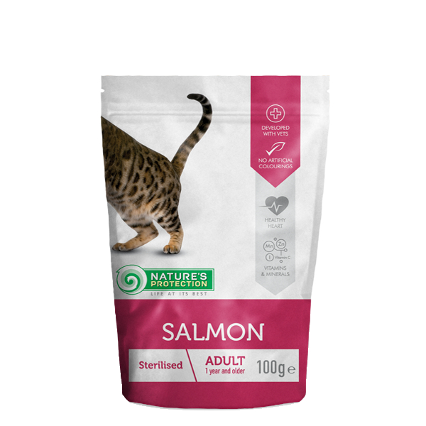 Сьомгата е най-популярната лесно смилаема риба, пълна с омега-3 мастни киселини, което спомага за поддържането на лъскава козина и здрава кожа. Подходящ за стерилизирани или склонни към затлъстяване котки, помага за поддържане на оптимално тегло.
