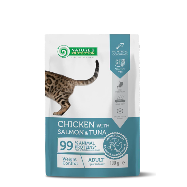 Пауч с пиле, сьомга и риба тон за контрол на теглото при израснали котки.