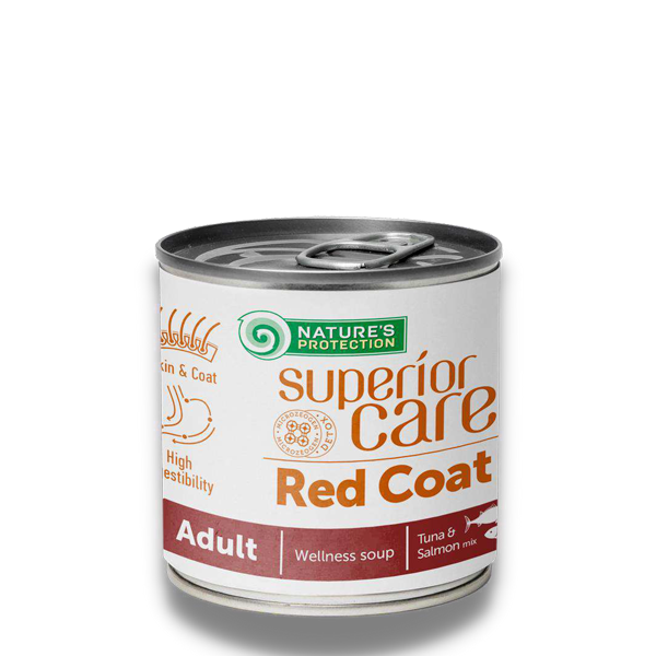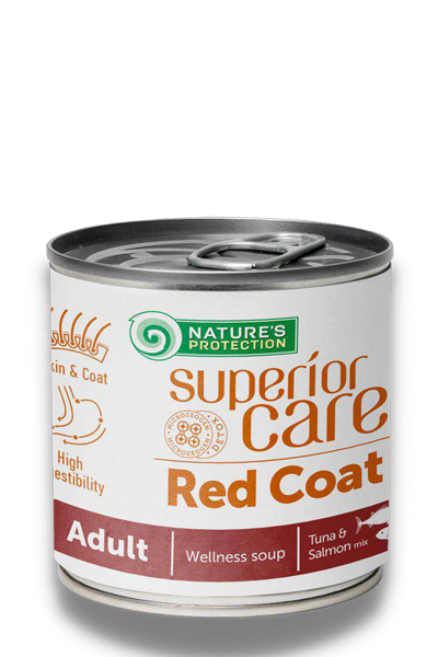 Nature’s Protection Superior Care е първокласна хранителна добавка – супа със сьомга и риба тон, специално разработена за израснали кучета с червена козина. Този продукт може да ви помогне да запазите козината и кожата на вашия домашен любимец здрави.