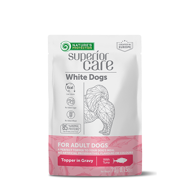 Пауч за израснали кучета с бяла козина с риба тон - с грижа за храносмилателната система.