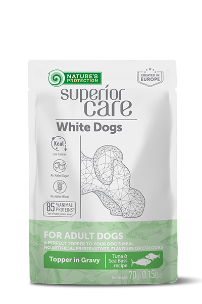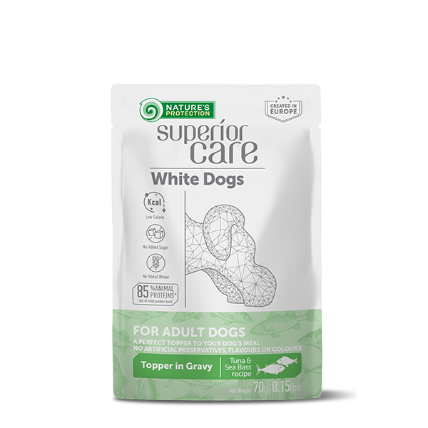 Пауч за израснали кучета с бяла козина с риба тон и лаврак - с грижа за храносмилателната система.