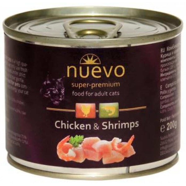 Нуево "Пиле и Скариди" черпи сетивата на вашата котка с всички необходими нутриенти. В основата му е подбран пилешки протеин и деликатни скариди. Свежите съставки задоволяват вкуса и на най-капризните котки. Високто съдържание на месо и скариди богати на Ω-3 и Ω-6 мастни киселини благоприятсва за красива и здрава козина.