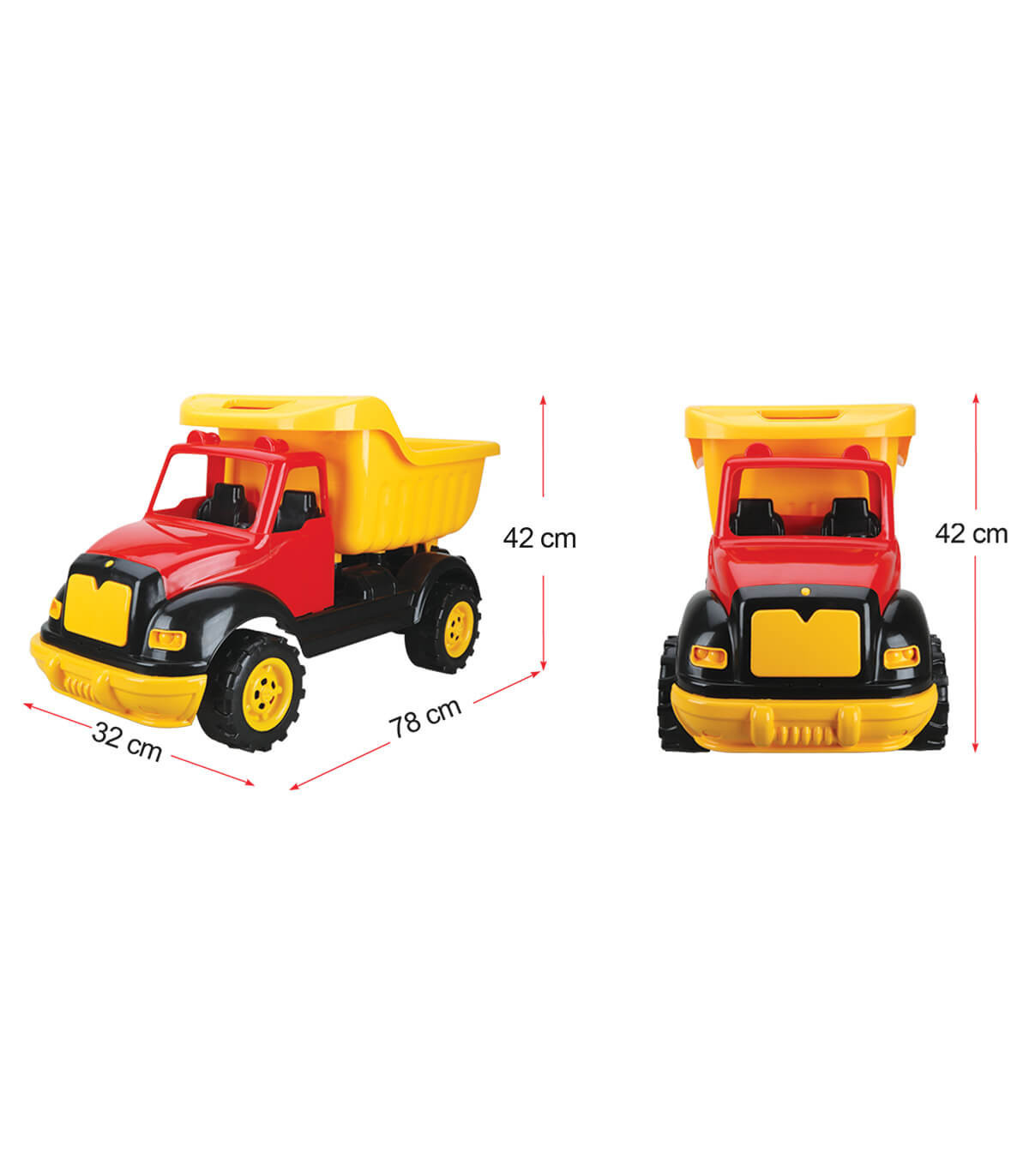 Детски голям камион самосвал, подходящ за игри у дома, на двора и на плажа. Изработен е от издръжлива пластмаса със заоблени ръбове, устойчива на интензивно използване, в цветове, които не избледняват от слънцето. Притежава просторна кабина и повдигаща се каросерия, която е достатъчно голяма, за да може да превозва пясък, дребни камъчета и други „строителни“ материали. А масивните колела с грайфер ще преодолеят всякакви препятствия по трасето.
