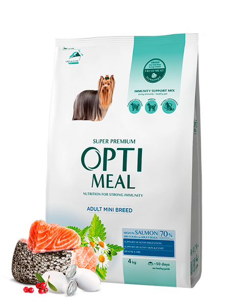 OPTIMEAL Super Premium Adult Mini Breed – Пълноценна суха храна за възрастни кучета от миниатюрни породи с високо съдържание на сьомга