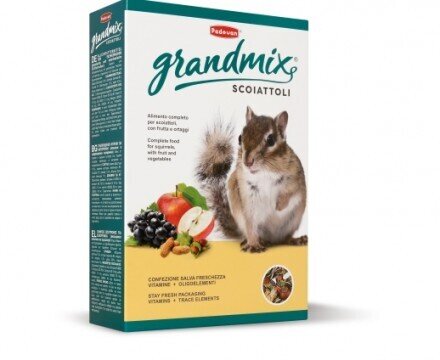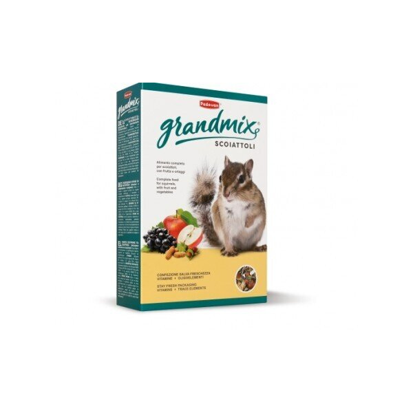GRANDMIX scoiattoli - съдържа семена, подбрани в оптимални пропорции, и е обогатена с плодове, зърнени храни и билки.Състав: Семена, зърнени храни, плодове (4,1%), зеленчуци, минерали, масла и мазнини, вторични продукти от растителен произход.