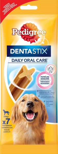 Pedigree Dentastix Daily Oral Care : С уникална по рода си Х-форма Комбинация от специална текстура и активно действащи съставки При всекидневна употреба, подпомагат изчистването на зъбния камък до 80% (научно доказано) Едновременно почистват зъбите и са занимавка за кучето Подходяща големина на пръчиците за всички кучета Предлагат се и в големи опаковки Pedigree Dentastix Daily Oral Care са практично решение за поддръжка на зъбите на кучето в перфектно здравословно състояние. Лакомствата Dentastix се грижат за зъбите на Вашето куче, докато то се забавлява, дъвчейки ги.