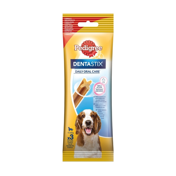 Pedigree Dentastix Daily Oral Care : С уникална по рода си Х-форма Комбинация от специална текстура и активно действащи съставки При всекидневна употреба, подпомагат изчистването на зъбния камък до 80% (научно доказано) Едновременно почистват зъбите и са занимавка за кучето Подходяща големина на пръчиците за всички кучета Предлагат се и в големи опаковки Pedigree Dentastix Daily Oral Care са практично решение за поддръжка на зъбите на кучето в перфектно здравословно състояние. Лакомствата Dentastix се грижат за зъбите на Вашето куче, докато то се забавлява, дъвчейки ги.