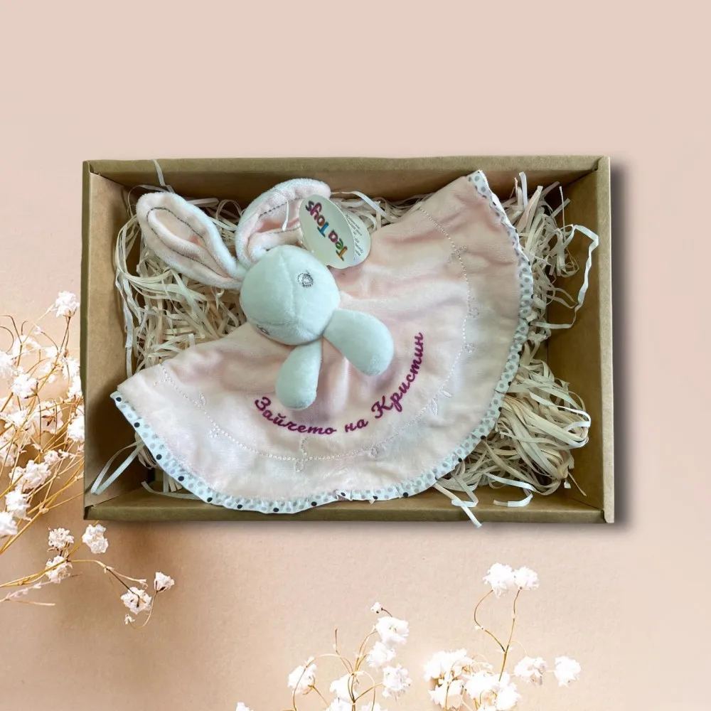 Мека играчка за гушкане зайче с надпис е прекрасен аксесоар за бебче.