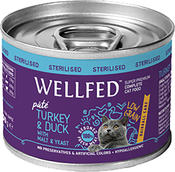 Консерва за котка – Wellfed Пълноценна храна за стерилизирани котки – Пуйка и Патица (12 месеца – 7 години). Храна, подходяща за възрастни кастрирани котки с проблеми с космения фоликул за грижа за козината – Пуйка и патица Пълноценно, балансирано хранене с превъзходно качество от 100% прясно задушено месо с минимално количество въглехидрати (0,2%) малц и дрожди, които помагат на подвижността на червата за да елиминира космените фоликули (космените топки). От момента на кастрация метаболизмът на котката се променя, така че се нуждае от храна, обогатена с L-карнитин, който превръща мастните киселини в чиста енергия, и с DL-метионин, като силен антиоксидант и аминокиселина. Вкусна диета, за да поддържате котката си пълна с енергия и в чудесно настроение! Ветеринарно тествани, с вкус, аромат и текстура за биологичните нужди на животните в природата. Съдържа: 70% месо, сърца и черен дроб (55% пуйка, патица 15%), бульон 28,7%, минерали 1%, 0,1 малц, 0,1% дрожди. Протеини: 10.60% Сурови мазнини: 6.10% Сурови фибри: 0.40% Сурова пепел: 2.30% Влага: 80.00% Хранителни добавки – витамин D3 200i.e, мед като cupric-сулфат, Пентахидрат 0,5mg., цинк като цинков сулфат, монохидрат 25mg, манган като манган-л-сулфат, монохидрат 1,4mg, йод като калцийjodat 0,75mg, таурин 1500mg, DL-метионин 20mg, L-карнитин 200mg. Метаболизируема енергия: 88.87 Kcal / 100gr Пълноценна храна за стерилизирани котки Защита от космените топки Пастет + малц + мая 97% месо Без консерванти Ниско ниво на въглехидрати Без изкуствени оцветители Хипоалергенна храна Ниско ниво на магнезий